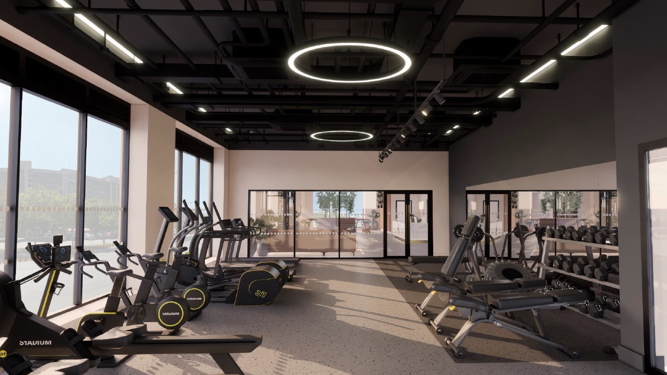 Communal spaces include a residents’ lounge ideal for remote working or socialising, alongside a fully equipped gym with floor-to-ceiling windows. Outdoor seating areas further enhance the development, creating spaces where residents can relax and connect with their neighbours.