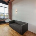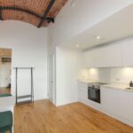 The apartment combines modern living with charming industrial character, featuring a large floor-to-ceiling window, exposed brickwork, and high-specification finishes throughout, including integrated kitchen appliances and a video entry intercom system.