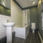 Fully fitted three piece bathroom suite with hand wash basin, WC and bath with over head shower, glass shower screen and tiled splash back