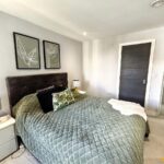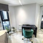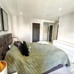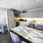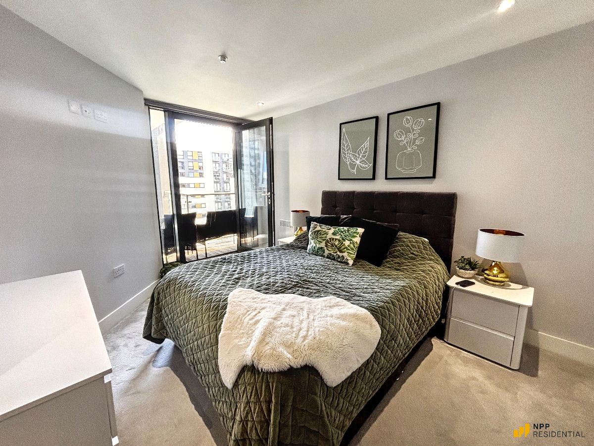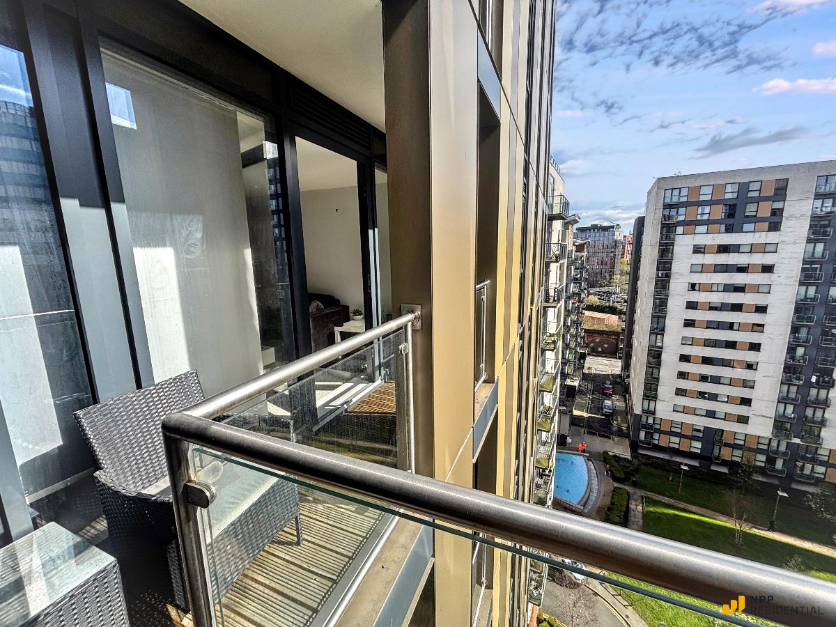 The apartment boasts a spacious open-plan kitchen and living area, with floor-to-ceiling glass doors that flood the space with natural light and open onto a private balcony overlooking the communal courtyard with views towards the city centre, perfect for both relaxing and entertaining. There are two well-proportioned bedrooms, each featuring fitted mirrored wardrobes. The master bedroom benefits from a contemporary en-suite shower room, while the second bedroom is ideal for guests, a home office, or additional living space. Both the living area and master bedroom enjoy direct access to the balcony.
