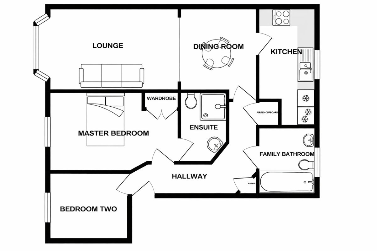 The accommodation briefly comprises an entrance hall, two double bedrooms (the Master bedroom benefiting from fitted wardrobes and an en suite shower room), and a main bathroom fitted with a bath, wash basin and WC. There is a spacious open-plan living and dining area, together with a separate kitchen.