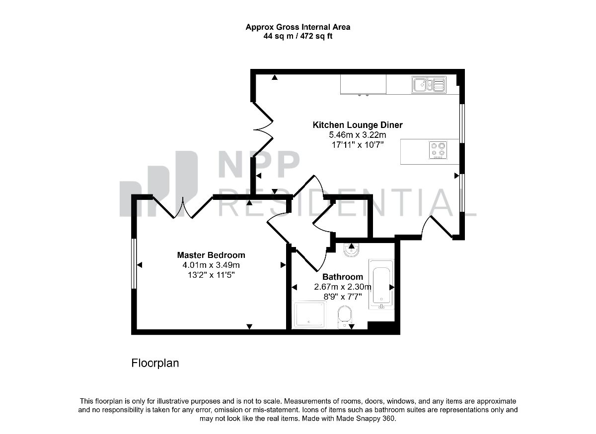 The property comprises a bright open-plan living room with a modern, fully fitted kitchen, a well-proportioned double bedroom, and a main bathroom suite, all presented to a good standard throughout. Both the living area and the bedroom benefit from direct access to the private patio, creating a great sense of space and easy indoor-outdoor living.
