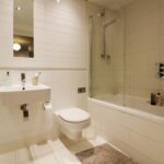 Full en-suite bathroom with WC, hand wash basin with mixer tap, bath with shower over head and a glass shower screen. Heated towel rail and tiled through out.